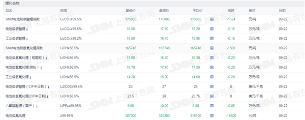 发布时间:2024-12-29 | 发布者: 东东工作室 | 浏览次数: 次证券之星新能源车行业周报:据上海有色网,截止9月22日,电池级碳酸锂16.5-17.9万元/吨,环比上一工作日下跌1500元/吨;工业级碳酸锂15.5-16.4万元/吨,环比上一工作日下滑1500元/吨。近期随着碳酸锂价格的持续下探,部分锂盐企业制造成本已被击穿,逐步调低开工,产量走低,部分厂家挺价心态渐强,跌幅有所收窄。