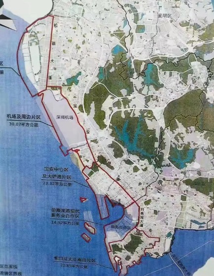 机场及周边片区(东至宝安大道,南至金湾大道、宝源路、碧湾路,西至海岸线,北至福永河、松福大道、福洲大道)30.07平方公里;