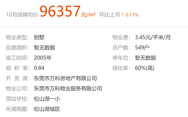 而记者根据东莞安居客网站查询结果,二手房参考价为4.3万元/㎡的东莞松山湖1号花园在10月份的挂牌均价为9.6万元/㎡。