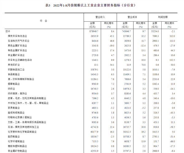 2022年1—8月份全国规模以上工业企业利润下降2.1%