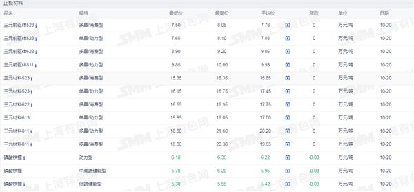 发布时间:2024-10-25 | 发布者: 东东工作室 | 浏览次数: 次证券之星新能源车行业周报:据上海有色网,截止10月20日,电池级碳酸锂16.70- 17.80万元/吨,均价17.25万元/吨,环比上一工作日下滑0.1万元/吨;工业级碳酸锂16.0-16.7万元/吨,均价16.35万元/吨,环比上一工作日下滑0.1万元/吨。近期锂盐价格走势逐渐趋弱,整体看,当前产业链上下游的僵持行情仍在持续,下游实际需求低迷,对高价锂盐依旧持一种不备、不采的态度,市场整体零单成交较为清淡。而部分厂商在这种情况下,报价下行,市场重心逐步下行,锂盐价格转跌。