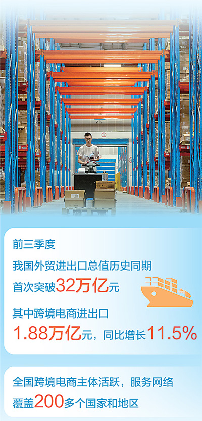 海关总署不久前发布的数据显示:今年前三季度,我国外贸进出口总值历史同期首次突破32万亿元,其中跨境电商进出口1.88万亿元,同比增长11.5%。作为以科技创新为驱动,积极运用新技术、适应新趋势、培育新动能的外贸新业态新模式,跨境电商已经成为我国外贸发展的有生力量,为全球消费者提供了更多元化的购物选择。