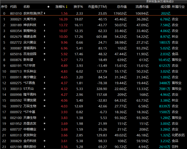 连续下跌10天后,6月22日农林牧渔(申万)指数全天上涨,最后收涨1.56%。80只相关个股飘红,其中神农科技、敦煌种业、福建金森、众业菌业涨停,而回盛生物等9只个股收跌。