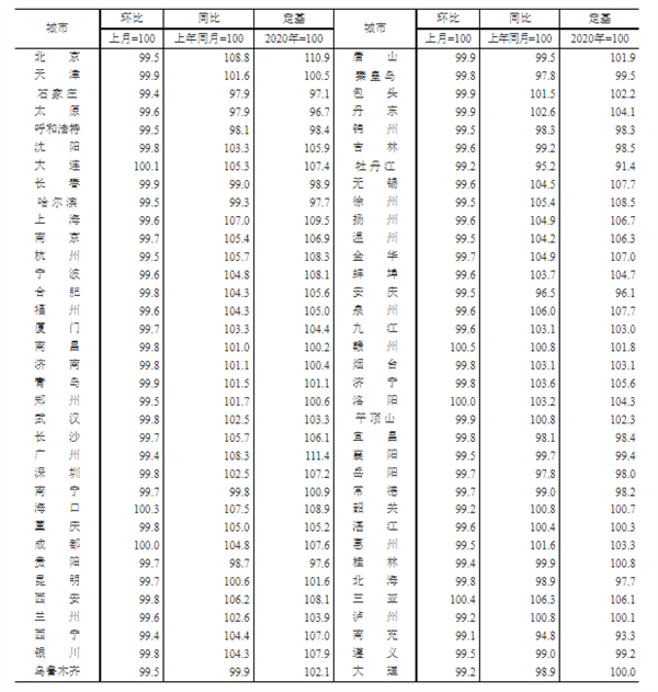 表1:2021年10月70个大中城市新建商品住宅销售价格指数