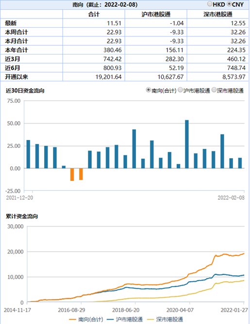 Wind统计数据显示,自互联互通开通以来,港股南向通已经累计净流入1.92万亿元,其中沪市港股通和深市港股通分别净流入1.06万亿元和8573.97亿元。