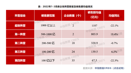 1-3月,不同阵营销售额增速分化较大,第一、三阵营同比增长。据中指院统计,千亿以上阵营2家,销售额均值同比下降22.1%。第一阵营(500-1000亿)共2家,销售额均值同比增长19.4%,为四个阵营中增速最快的。第二阵营(200-500亿)有18家企业,销售额均值增长率为-0.7%;第三阵营(100-200亿)共24家,销售额均值增长率为6.2%。第四阵营共35家,销售额均值增长率为-22.3%。