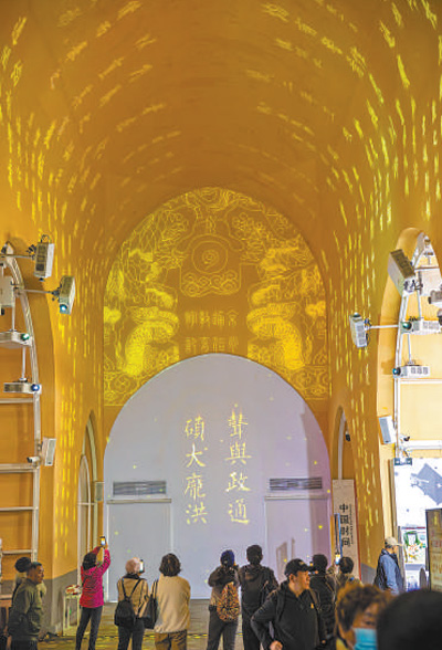 游客在北京鼓楼沉浸式体验“中轴奇妙夜”。