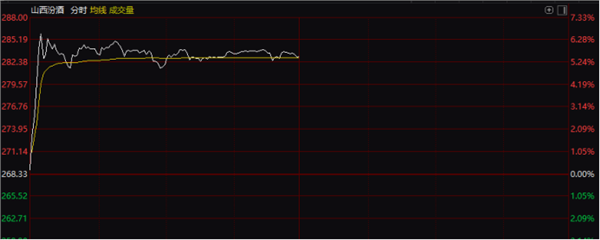 不过山西汾酒的大涨并未带动整个白酒板块表现,上午贵州茅台、五粮液等白酒龙头表现整体低迷。