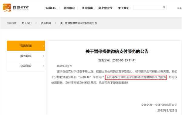 近日,安徽ETC发布公告称,鉴于微信支付手续费不断上涨,与腾讯公司积极协商无果后,将停止提供微信支付服务。