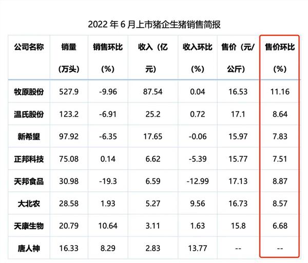 《国际金融报》记者留意到,截至7月11日,生猪养殖巨头牧原股份、温氏股份等多家公司已先后披露了2022年6月生猪销售数据,从商品平均猪价格来看,猪价正在持续回暖之中,温氏股份、新希望、正邦科技、天邦食品的生猪售价均超过15元/公斤,天邦食品甚至达到17.13元/公斤。