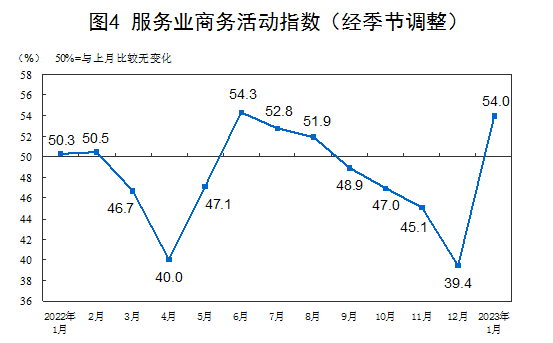 1月份,非制造业商务活动指数为54.4%,比上月上升12.8个百分点,重返扩张区间,非制造业景气水平触底回升。