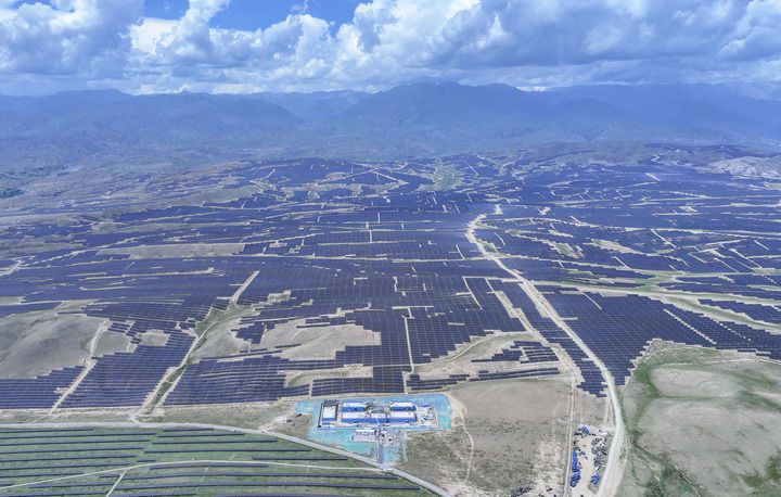 这是2024年6月11日在新疆伊犁哈萨克自治州拍摄的中国绿发尼勒克县400万千瓦风电光伏一体化项目(无人机照片)。新华社记者 赵戈 摄