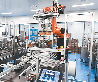 国药太极西南药业股份有限公司粉针剂车间的5G生产线,机械臂正在打包药品。