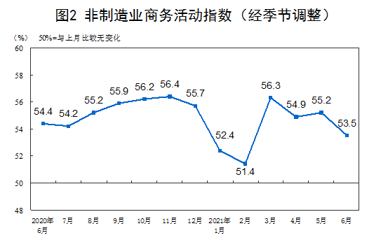6月份,非制造业商务活动指数为53.5%,低于上月1.7个百分点,非制造业延续扩张态势,但扩张力度有所减弱。
