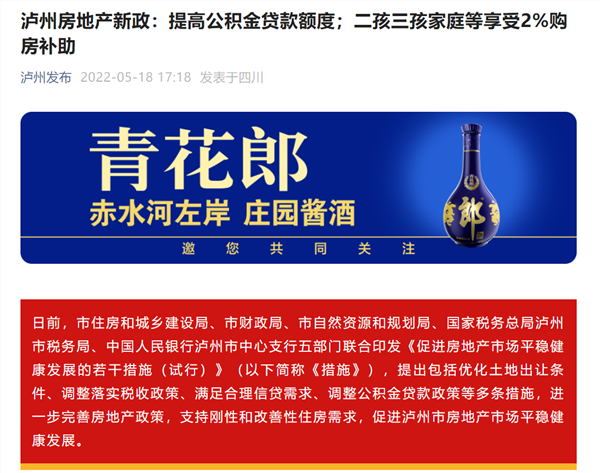 5月18日,“泸州发布”公众号发布消息称,泸州出台房地产新政:提高公积金贷款额度;二孩三孩家庭等享受2%购房补助。