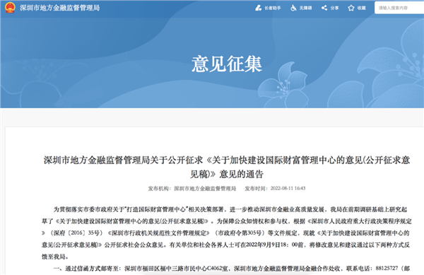 8月11日,深圳市地方金融监督管理局发布关于公开征求《关于加快建设国际财富管理中心的意见(公开征求意见稿)》意见的通告,发展目标是打造要素集聚、业态齐备、开放融合的现代化财富管理生态圈,财富管理行业规模、创新能力、开放水平、影响力竞争力达到国际领先水平。