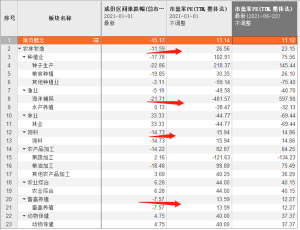 猪肉概念板块成份年内跌幅(总市值加权平均)逾15%,最新市盈率PE(TTM,整体法)降至11倍。农林牧渔(申万)板块成份年内跌近12%,其中渔业细分下的海洋捕捞跌约22%,饲料、畜禽养殖成份年内跌幅(总市值加权平均)分别约为15%、8%,最新市盈率PE(TTM,整体法)分别为15倍、12倍。