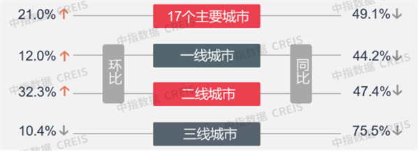 二线代表城市环比上升32.3%,同比下降47.4%。环比上升的城市中,苏州升幅显著,为67.4%;福州次之,升幅为53.4%;武汉升幅为51.2%,位居第三。重点监测的城市中,南京环比降幅较大,为20.8%。