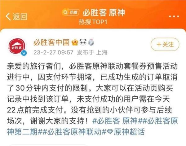对此,必胜客回应称:必胜客原神联动套餐券预售活动进行中,因支付环节拥堵,已成功生成的订单取消了30分钟内支付的限制。大家可以在活动页购买记录中找到该订单,未支付成功的用户需在当天22点前完成支付。没有抢到的小伙伴可参与后续场次。