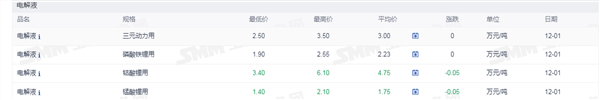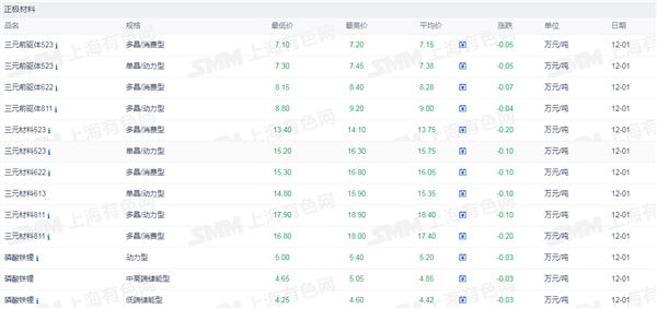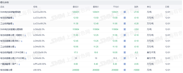 发布时间:2025-11-16 | 发布者: 东东工作室 | 浏览次数: 次证券之星新能源车行业周报:据上海有色网,截止12月1日,电池级碳酸锂12.50-13.50万元/吨,均价13.00万元/吨,环比上一工作日下滑0.10万元/吨;工业级碳酸锂11.30-12.40万元/吨,均价11.85万元/吨,环比上一工作日下滑0.20万元/吨。供应端,近期部分上游大厂开始逐步放出前期储备库存,锂盐市场流通有所增量,但当前下游采买需求依旧疲软,供强需弱之下,市场看跌情绪依旧浓重,价格承压下行。