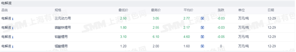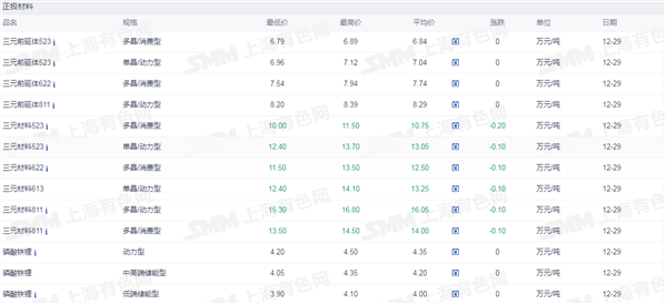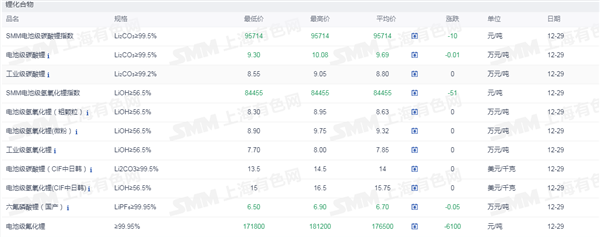 发布时间:2025-11-16 | 发布者: 东东工作室 | 浏览次数: 次证券之星新能源车行业周报:据上海有色网,截止12月29日,电池级碳酸锂9.3-10.08万元/吨,均价9.69万元/吨,环比上一工作日下滑0.01万元/吨;工业级碳酸锂8.55-9.05万元/吨,均价8.80万元/吨,环比上一工作日持平。临近年末,市场成交依旧维持清淡局面。当前贸易商因近期期现货价差扩大,进行持续期现货套利,对锂盐端采买需求小幅增加,而部分盐厂在期货价格相对较高的情况下,交仓意愿亦有所增强,供应端挺价情绪渐浓,市场维持弱稳局面。