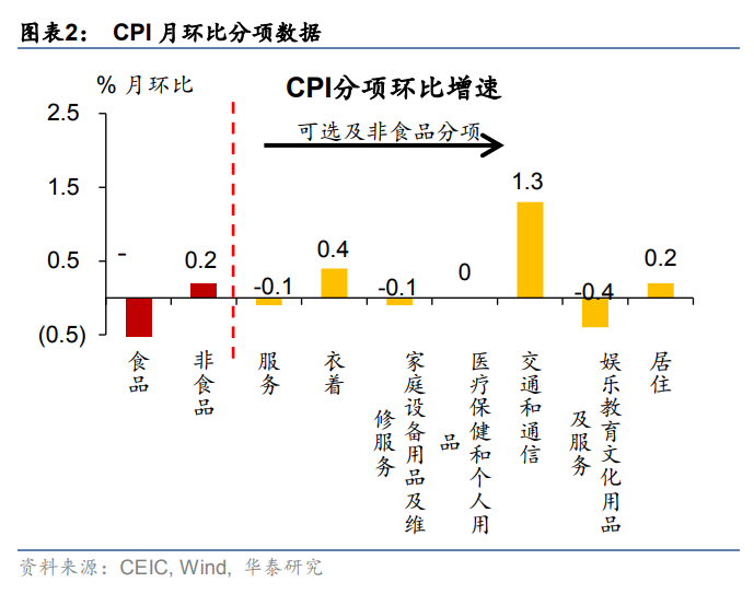 从分项上看,3月CPI食品同比-0.7%,回落0.5个百分点,环比-3.6%(历史同期均值为-1.9%)。猪价跌幅扩大,环比-10.9%,同比走低3.5个百分点。菜价由涨转跌,环比-14.5%,同比走低17.8个百分点。非食品同比0.7%,回升0.9个百分点,环比0.2%(历史同期均值为0%)。其中交通通信环比涨幅较大;教育文娱、居住环比涨幅略强于季节性。