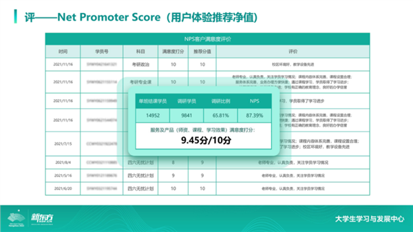 关于“测”的部分,我们有专业的测评体系,所有的教学和服务最后都需要通过NPS进行反馈,NPS就是学生有多大概率会把我们的产品和服务推荐给相关的这些亲朋好友,分值越高,质量就会越高。