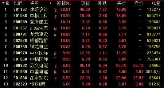 发布时间:2025-12-15 | 发布者: 东东工作室 | 浏览次数: 次今日基建板块大幅走高,截止发稿,建研设计、重庆建工、龙元建设、成都路桥、中材国际、中铝国际涨停;中国电建、深水规院等个股涨幅超5%。