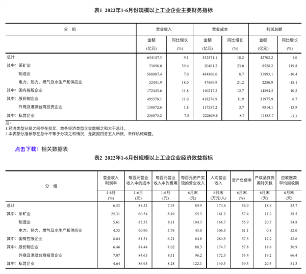 周三上午,国家统计局数据显示,1-6月份,全国规模以上工业企业实现利润总额42702.2亿元,同比增长1.0%(按可比口径计算)。