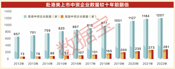 过去十年,赴美上市中资企业由大型国企转变为互联网民营企业。赴美上市的中资企业有400余家,目前中概股有281家,较十年前增加近3倍,京东、阿里、拼多多等互联网巨头先后在纳斯达克、纽约交易所上市。香港中资企业(含A+H股)有1207家,数量较十年前增加80%。