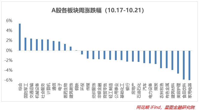 板块来看,有11个板块实现了上涨,环比减少14个板块,从数据上也映证了A股的回撤。家用电器方面由于10月疫情多发,线下零售依旧承压,跌近6%,领跌所有板块,食品饮料继续受到茅台拖累,跌超5.5%,其余大消费板块表现较差;而周内消息面频发利好的高端制造业则涨幅居前,包括国防军工、机械设备、TMT板块等,涨幅都在2%左右及以上。整体来看本周各板块出现的走势也在意料之中,市场信心企稳才是最重要的,投资者风险偏好上升。