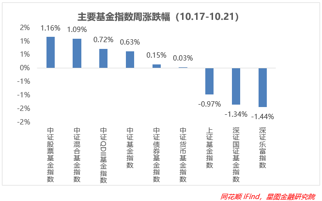 上周基金表现整体上进一步向好,上涨的指数数量多余下跌指数。其中受益于权益市场的回暖,股基、混基领涨,均涨超1%;上上周领涨的深市基金指数出现较大调整,乐富、国证基金指数分别跌1.44%、1.34%;上证基金指数同样出现回调,跌幅未超过1%;QDII基金指数受到外围股指回暖,表现不错,涨幅为0.72%;中证基金指数得益于成份股中医疗领域的拉升,涨幅也不小,债基、货基变化不大。