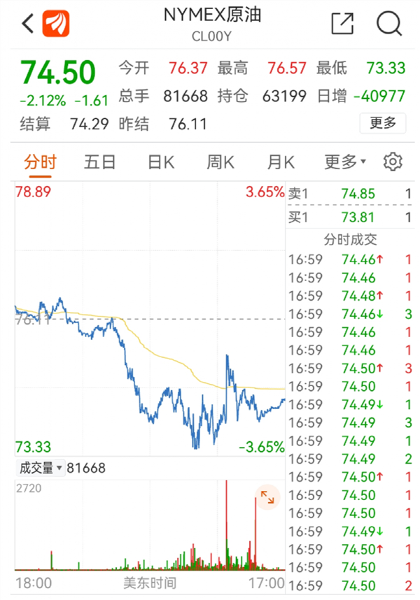 不过,还是来看下本周的油价表现:美欧周五的多项疲软经济数据令投资者看衰石油需求前景,国际油价周五显著下跌。纽约原油期货收盘报74.5美元/桶,布伦特原油期货收盘报79.26美元/桶。