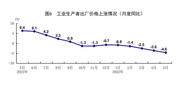 5月份,全国工业生产者出厂价格同比下降4.6%,环比下降0.9%。全国工业生产者购进价格同比下降5.3%,环比下降1.1%。1-5月份,全国工业生产者出厂价格和购进价格同比分别下降2.6%和2.3%。