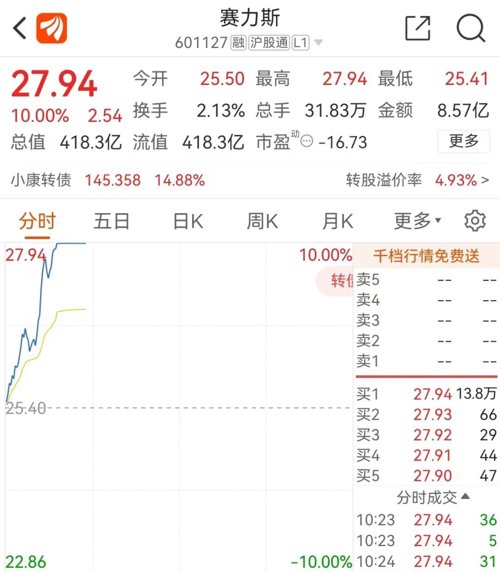 受此消息影响,12日早盘,赛力斯涨停,总市值重回400亿上方。