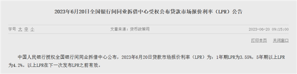 发布时间:2025-12-18 | 发布者: 东东工作室 | 浏览次数: 次6月20日,人民银行授权全国银行间同业拆借中心公布了新一期贷款市场报价利率(LPR)。其中,1年期LPR为3.55%,上月为3.65%;5年期以上LPR为4.2%,上月为4.3%。1年期LPR、5年期以上LPR均较上月下降10个基点。