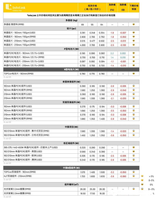 而需求方面,7月部分新签订单拉货仍有延迟,终端业主仍有观望情绪存在,仍需端看整体供应链价格是否能维持,7月组件排产目前犹疑不定,一线厂家排产有上升趋势,单月排产暂时评估将落在45-47GW,一线组件厂家希望维稳价格,然而后段厂家报价仍较为激进,四季度报价已听闻1.2元人民币,总体来看,当前组件价格1.3-1.4已无太多毛利空间,后续价格调整空间将较为受限,后续价格走势将呈现缓和跌价趋势,长期价格恐将在1.2-1.35之间波动,三季度需观察需求以及限电影响,也不排除有短期反弹的可能性。