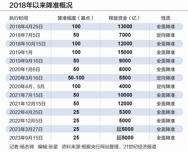 9月14日晚间,央行公告称,决定于2023年9月15日下调金融机构存款准备金率0.25个百分点(不含已执行5%存款准备金率的金融机构)。本次下调后,金融机构加权平均存款准备金率约为7.4%。