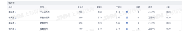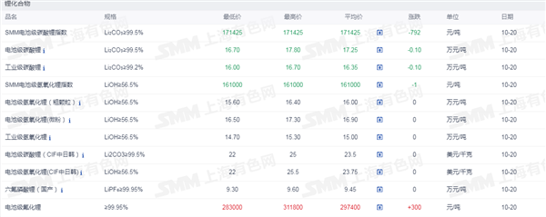 发布时间:2025-12-19 | 发布者: 东东工作室 | 浏览次数: 次证券之星新能源车行业周报:据上海有色网,截止10月20日,电池级碳酸锂16.70- 17.80万元/吨,均价17.25万元/吨,环比上一工作日下滑0.1万元/吨;工业级碳酸锂16.0-16.7万元/吨,均价16.35万元/吨,环比上一工作日下滑0.1万元/吨。近期锂盐价格走势逐渐趋弱,整体看,当前产业链上下游的僵持行情仍在持续,下游实际需求低迷,对高价锂盐依旧持一种不备、不采的态度,市场整体零单成交较为清淡。而部分厂商在这种情况下,报价下行,市场重心逐步下行,锂盐价格转跌。