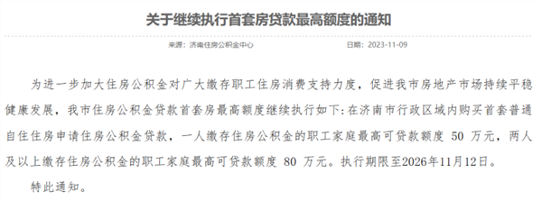 11月9日,济南住房公积金中心发布《关于继续执行首套房贷款最高额度的通知》。