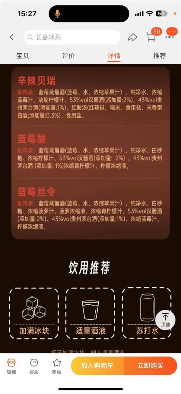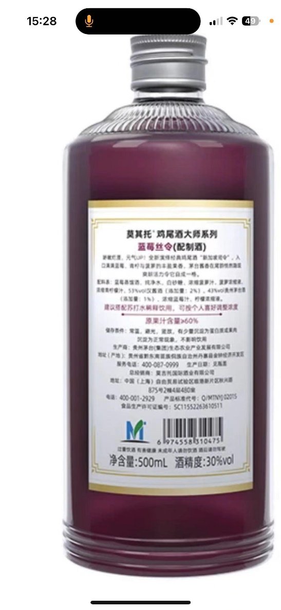 其次,这款产品中使用的也不是常规意义上的飞天茅台酒,这三种口味产品中,辛辣贝瑞使用的是43度贵州茅台酒(添加量:1%),而蓝莓酸和蓝莓丝令均采用的是53度汉酱酒(添加量:2%)