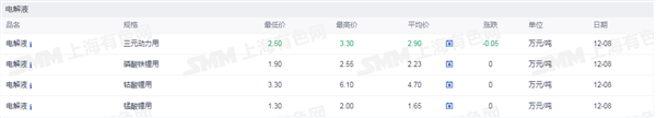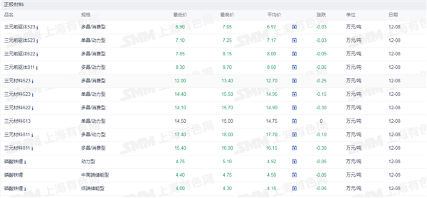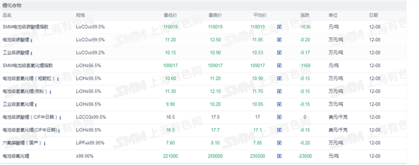 发布时间:2025-12-19 | 发布者: 东东工作室 | 浏览次数: 次证券之星新能源车行业周报:据上海有色网,截止12月8日,电池级碳酸锂11.2-12.5万元/吨,均价11.85万元/吨,环比上一工作日下滑0.2万元/吨;工业级碳酸锂10.15-10.9万元/吨,均价10.53万元/吨,环比上一工作日下滑0.17万元/吨。12月8日市场中锂盐企业的出货情绪抬升,个别锂盐企业和正极材料以11.2万元/吨价格成交较多的电池级碳酸锂,而盐湖企业和回收锂盐企业观望情绪抬升,并无明显出货打算。近期正极材料企业询价和拿货意愿更为积极,但由于贸易企业盘面套保难以平仓而限制其销售碳酸锂现货,正极材料更多偏向于向锂盐企业采购。但目前正极材料企业反馈其订单无明显增量迹象,其在进行采购并补充碳酸锂原料库存后,对于碳酸锂的采购或也难有持续大幅放量的情况出现。