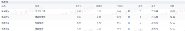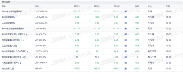 发布时间:2025-12-20 | 发布者: 东东工作室 | 浏览次数: 次证券之星新能源车行业周报:据上海有色网,截止12月22日,电池级碳酸锂9.4-10.5万元/吨,均价9.95万元/吨,环比上一工作日下滑0.05万元/吨;工业级碳酸锂8.8-9.3万元/吨,均价9.05万元/吨,环比上一工作日下滑0.05万元/吨。近期下游正极材料企业对碳酸锂的采购需求依然疲软,而市场中个别锂盐企业依然存出货意愿,供需博弈下市场碳酸锂现货价格仍弱势运行。另外,近期贸易企业出货情况同样不容乐观,部分贸易企业后续有交仓想法。
