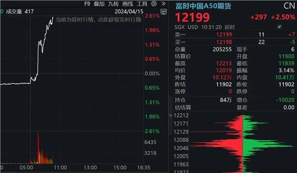 虽然盘中沪指一度跳水翻绿,但富时中国A50指数期货并没有出现跳水。值得关注的是,外资持续涌入抄底。开盘20多分钟时间,北向资金就净买入超100亿元。另外,富时中国A50指数期货涨幅扩大至2.5%,突破12200点。