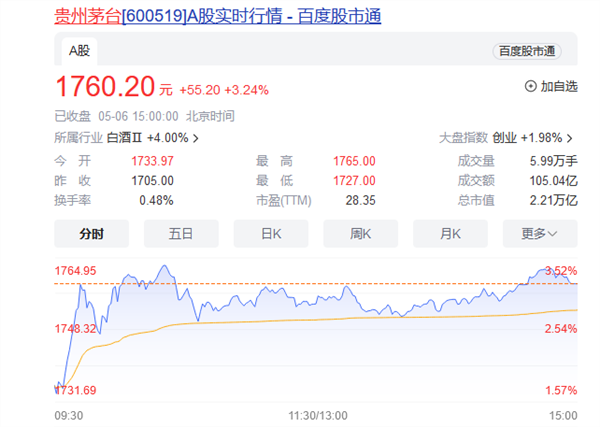 酒类股今日强势拉升,截至收盘,酒鬼酒涨停,舍得酒业、水井坊涨约7%,青岛啤酒涨超6%;贵州茅台涨超3%,盘中最高至1765元,创年内新高,最新市值22112亿元,市值重回A股首位。