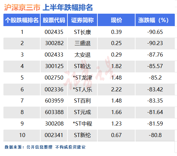 上半年的A股市场ST跌幅榜单中,ST股长康、三盛退、太安退等个股赫然在列,成为市场关注的焦点。其中,ST股长康(002435.SZ)以高达90.65%的跌幅,不幸成为上半年跌幅最大的个股,并因连续34个一字跌停而锁定退市。