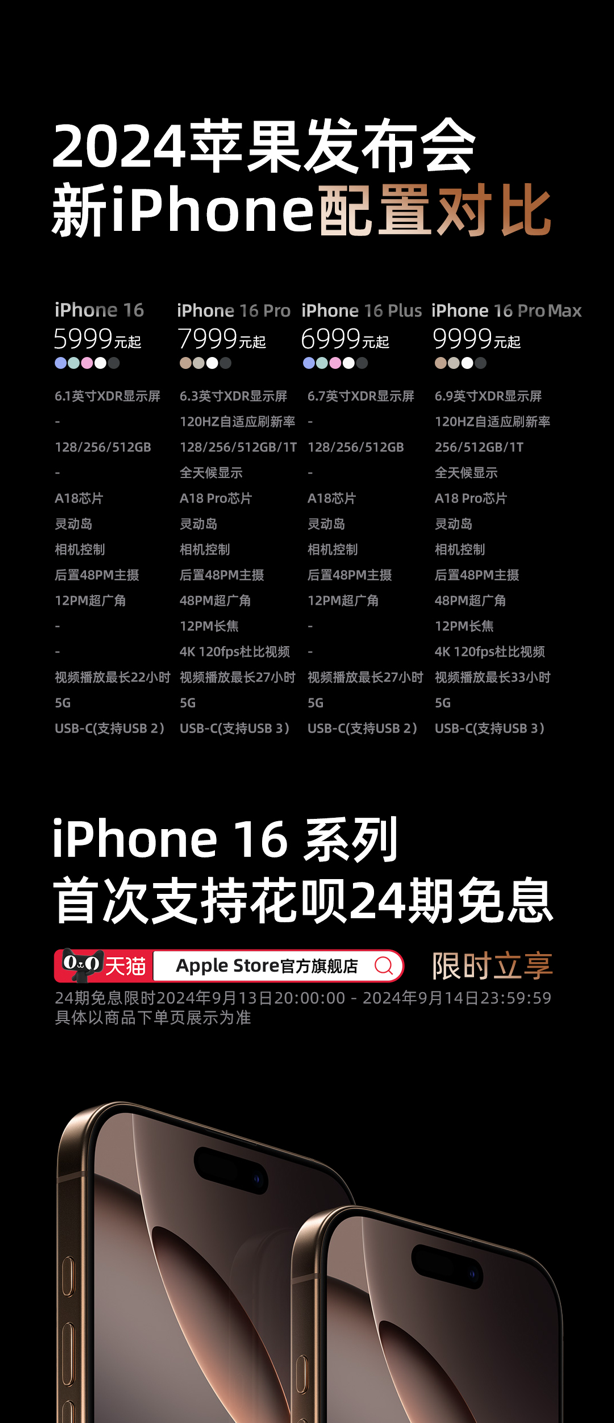 苹果天猫旗舰店发新首次支持花呗24期免息,预售前28小时可享