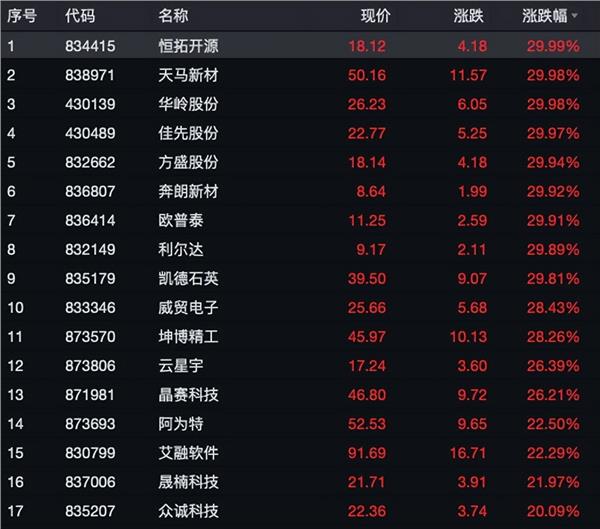 北证50指数盘中涨逾10%,天马新材4连板,方盛股份、佳先股份、坤博精工、奔朗新材等十余股涨超20%。
