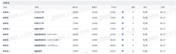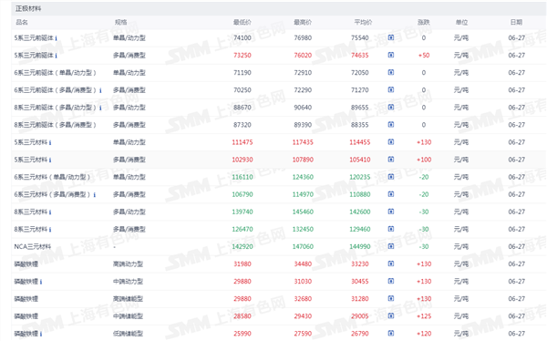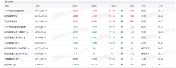 发布时间:2025-12-24 | 发布者: 东东工作室 | 浏览次数: 次证券之星新能源车行业周报:据上海有色网,截止6月27日,电池级碳酸锂6.04-6.19万元/吨,均价6.115万元/吨,环比上一工作日上涨550元/吨;工业级碳酸锂5.905-6.005万元/吨,均价5.955万元/吨,环比上一工作日上涨550元/吨,碳酸锂现货成交价格重心呈现震荡上行。当前碳酸锂市场仍延续供大于求的基本格局,供需矛盾依然突出。从供应端看,市场可流通货源充足,库存压力尚未得到有效缓解。近期碳酸锂价格的阶段性回升主要受宏观及市场情绪等外部因素驱动,而非基本面改善所致。需求侧方面,下游正极材料企业仍保持审慎的采购策略,以刚性需求采购为主,尚未出现明显的补库意愿,市场整体观望情绪浓厚。在此市场环境下,下游材料企业更倾向于通过长协加量的方式锁定采购成本,以确保原料供应的稳定性。