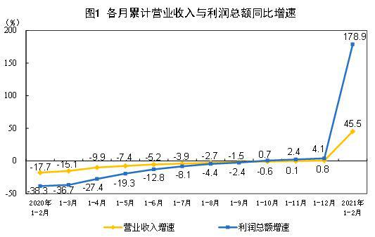 工业生产销售增长加快,带动盈利明显增加。年初以来,市场需求持续回暖,工业企业延续稳定恢复态势,生产销售较去年同期明显加快。1—2月份,规模以上工业增加值同比增长35.1%,两年平均增长8.1%;营业收入同比增长45.5%,两年平均增长9.4%。工业生产销售均达到近年较好水平,为企业效益改善创造有利条件。